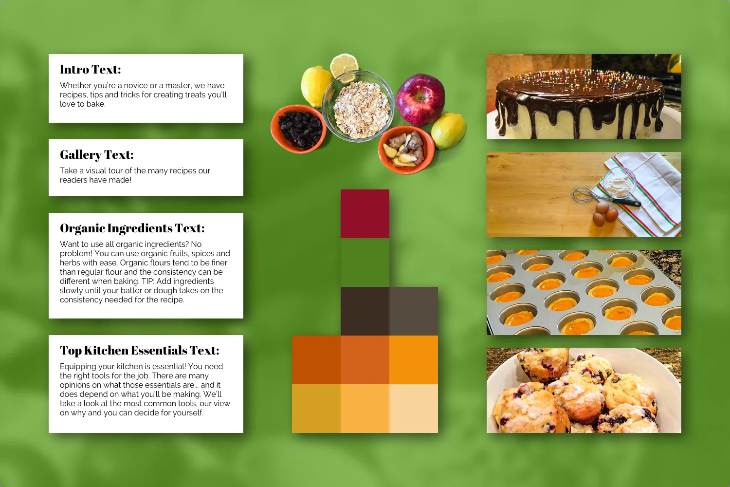 Provided with the project were a handful of copy requirements, as well as a color palette and images to populate the page with content.