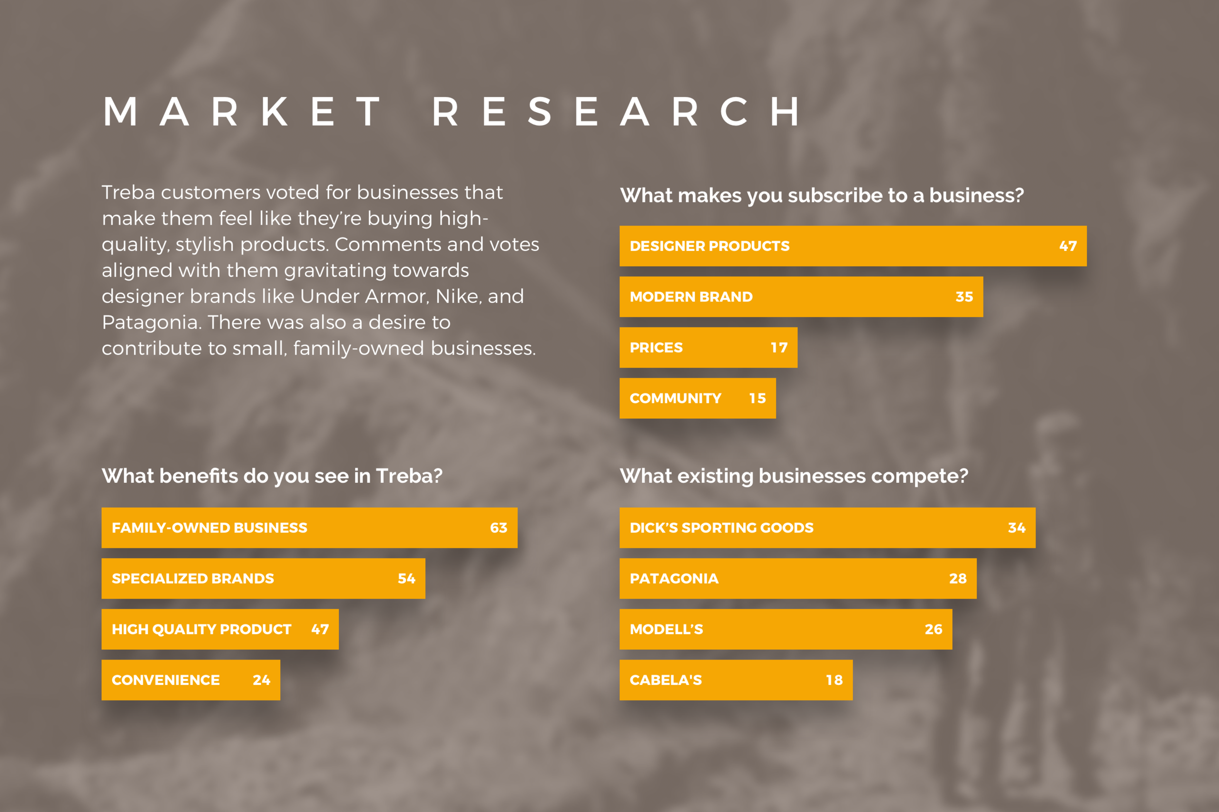 Treba customers voted for businesses that make them feel like they’re buying high-quality, stylish products. Comments and votes aligned with them gravitating towards designer brands like Under Armor, Nike, and Patagonia. There was also a desire to contribute to small, family-owned businesses.